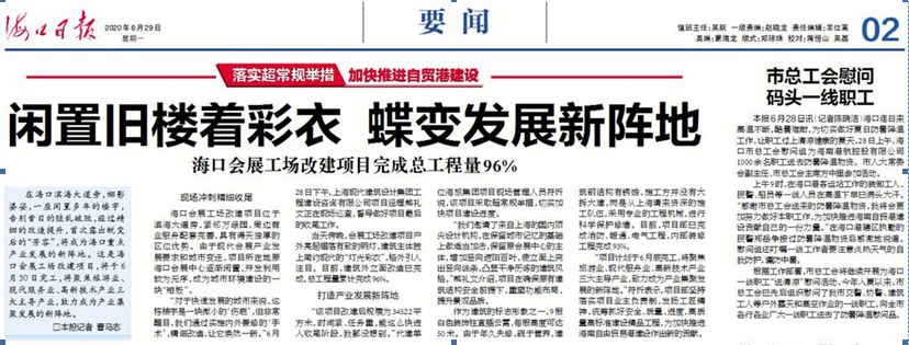 海口會展工場改建項目位于濱海大道旁,緊鄰萬綠園,周邊商業(yè)服務配套完善,具有得天獨厚的區(qū)位優(yōu)勢。由于現(xiàn)代會展產(chǎn)業(yè)發(fā)展要求和城市變遷,項目所在地原海口會展中心逐漸閑置,開發(fā)利用較為無序,成為城市環(huán)境建設的一塊“短板”。“對于快速發(fā)展的城市來說,這棟樓宇是一塊微小的‘傷疤’,但非常醒目,我們通過實施內(nèi)外兼修的‘手術’,精細改造,讓它煥然一新。”6月28日下午,上海現(xiàn)代建筑設計集團工程建設咨詢有限公司項目經(jīng)理熊禮文正在現(xiàn)場巡查,督導做好項目最后的收尾工作。